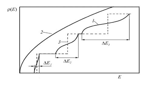 Густина електронних станів в напівпровідниковій надгратці істотно відрізняється від відповідної величини в тривимірній електронній системі. На рис. 7. показана залежність щільності електронних станів в надгратці від енергії Е [1]. Інтервал енергії містить три перші мінізони. Ширина кожної з цих мінізон позначена відповідно