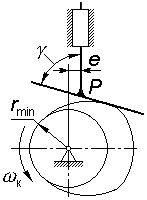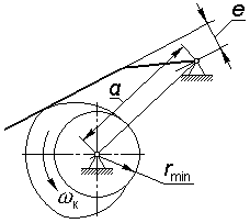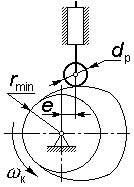 не задана, проектировщик согласовывает ее выбор с выбором значения теоретического минимального радиуса Примечание: на схеме показаны положительные направления угловой скорости кулачка и эксцентриситета e . |