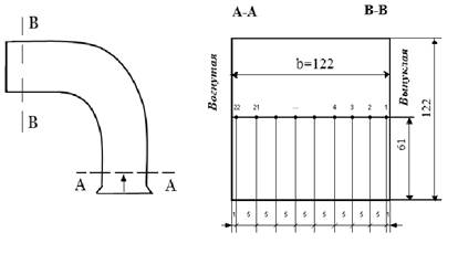 Экспериментальная модель представляет собой плоский криволинейный канал квадратного поперечного сечения с углом изогнутости оси 90° (рисунок 1). Для возможности визуального исследования потока верхняя стенка модели выполнена из прозрачного материала.