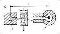 Прочность на срез (сдвиг) определяют в специальных стальных матрицах (рис. 6.7). Образец находится в условиях среза со сжатием. При испытаниях важно обеспечить равномерное распределение усилия пресса по сечению испытуемого образца. Испытания проводят на цилиндрических образцах указанных выше стандартных размеров. Зазор между разъемными половинами матрицы при вложенном в нее образце должен иметь постоянную ширину не более 2 мм.