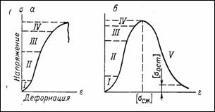 l-V - области: I - закрытия структурных дефектов, II - линейного деформирования, III - образования микротрещиноватости, IV - разветвления и слияния трещин, V - снижения грузонесущей способности.