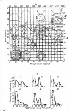 Весьма часто для решения практических вопросов, например оценки устойчивости обнажении пород, кроме относительных характеристик степени распространенности тех или иных систем трещин в исследуемом массиве требуются абсолютные значения указанных параметров, т. е. вероятностей появления тех или иных структурных неоднородностей в рассматриваемой точке выработки. С этой целью на каждой наблюдательной станции число трещин (или других структурных неоднородностей) отдельных систем относят к общему числу измеренных трещин и таким образом оценивают частоту (в пределе - вероятность) появления той или иной системы. Однако при этом возможны существенные погрешности вследствие того, что наблюдательные станции не в равной степени охватывают все пространство изучаемого массива. Например, при расположении наблюдательных станций в горизонтальных выработках слабо отражается распространение пологих и горизонтальных трещин.