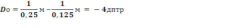 оптическая сила составной линзы – это хрусталик + линза очков, поэтому распишем формулу тонкой линзы в виде: