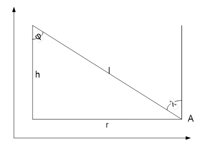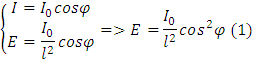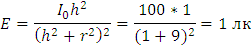 На высоте h=1м над горизонтальной плоскостью параллельно ей расположен небольшой светящийся диск. Сила света Iо диска в направлении его оси равна 100кд. Принимая диск за точечный источник с косинусным распределением силы света, найти освещенность Е горизонтальной плоскости в точке А, удаленной на расстоянии r=3м от точки, расположенной под центром диска.