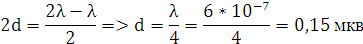 Плосковыпуклая линза выпуклой стороной лежит на стекляннй пластинке. Определить толщину d слоя воздуха там, где в отраженном свете ( λ=0,6мкм ) видно первое светлое кольцо Ньютона.