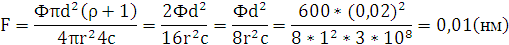 Поток энергии Фе, излучаемый электрической лампой, равен 600 Вт. На расстоянии r=1м от лампы перпендикулярно падающим лучам расположено круглое плоское зеркальце диаметром d=2см. Принимая, что излучение лампы одинаково во всех направлениях и что зеркальце полностью отражает падающий на него свет, определить силу F светового давления на зеркальце.