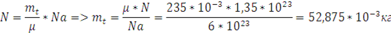 Определить массовый расход mt ядерного горючего 235 U в ядерном реакторе атомной электростанции. Тепловая мощность P электростанции равна 10МВт. Принять энергию Q1 выделяющуюся при одном акте деления, равной 200 МэВ. К.П.Д. η электростанции составляет 20%.