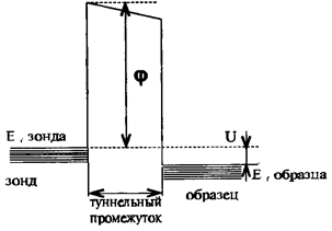В работе СТМ используется заостренная проводящая игла с приложенным напряжением смещения между ней и образцом; радиус кривизны иглы порядка 3 - 5 нм. При подводе иглы на расстояние около 10А от образца, электроны из образца начинают туннелировать через туннельный промежуток в иглу (или наоборот, в зависимости от знака приложенного напряжения смещения). Туннельный ток используется как механизм для получения картины исследуемой поверхности. Для его возникновения необходимо, чтобы образец и игла были проводниками либо полупроводниками. Для различных режимов сканирования записываемый (т.е. формирующий изображения) сигнал получается из величины туннельного тока различными методами. На Рис. 1 показана схема туннелирования электрона между образцом и зондом и приближении простейшей одномерной модели:
