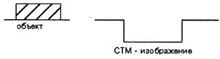 Очевидно, что наличие различных объектов между зондоми проводящей поверхностью будет существенно влиять на вероятность туннелирования и, соответственно, на величину туннельного тока. Это в некоторых случаях может мешать получить рельеф проводника а в некоторых случаях позволяет исследовать свойства пленок, нанесенных на проводящую подложку СТМ-изображение определяется как рельефом исследуемой поверхности так и ее лектронными свойствами. Если исследуется либо загрязненная поверхность, либо специально нанесенные объекты на проводящую подложку, то СТМ-изображение определяется не только рельефом исследуемого образца, но и локальными электронными свойствами поверхности. Например, участок проводника, покрытый неэлектропроводной пленкой, может выглядеть на СТМ изображении как провал, хотя на самом деле, это может быть выступ (Рис.3).