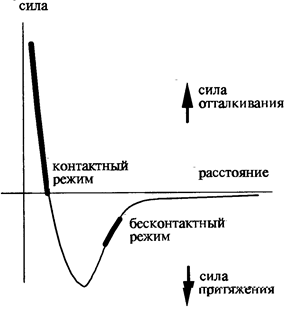Минимально возможное расстояние между иглой кантилевера и поверхностью образца в бесконтактном режиме определяется, с одной стороны, свойствами иглы кантилевера и поверхности, а с другой стороны - жесткостью балки кантилевера. Если по мере приближения зонда к поверхности по достижении некоторого расстояния между ними окажется, что градиент силы притяжения иглы к образцу превысил жесткость балки кантилевера, то кантилевер "прилипнет" к поверхности. Поэтому минимальная рабочая дистанция должна превышать это критическое расстояние. Наиболее значительной причиной притяжения являются, как правило, капиллярные эффекты, которые, к тому же, обладают большим собственным гистерезисом Но и в отсутствие капиллярных явлений, например, в случае несмачиваемых поверхностей, эффект "залипания" может наблюдаться из-за электростатических, магнитных и даже Ван-дер-Ваальсовых сил притяжения. Поэтому чем вы те жесткость кантилевера тем меньше может быть рабочее расстояние, и тем большего разрешения можно достичь (при удалениях, соизмеримых, или превы-шающих радиус кривизны кантилевера), хотя при этом возрастает и сила взаимодействия. Возможна также ситуация, когда градиент сил притяжения не превосходит жесткости кантилевера вплоть до касания иглы и поверхности, т.е. вплоть до сближения крайних атомов зонда и образца в область отталкивающего потенциала, и, значит, рабочее расстояние может быть сколь угодно малым. Такая ситуация является переходной между бесконтактным и полуконтактным режимом.