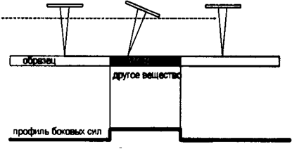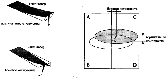 Во время сканирования по +Х или -X возникает дополнительная крутильная деформация кантилевера. Она обусловлена моментом сил, действующих на острие иглы. Угол кручения при небольших отклонениях пропорционален боковой силе. Измерительная система микроскопа позволяет регистрировать кручение кантилевера. Луч лазера, отраженный от кантилевера, получает в этом случае дополнительное смещение в боковом направлении (Рис.6). В этом случае регистрируется сигнал (А+В) - (С+D). Для измерения боковых сил АСМ работает в режиме поддержания постоянной силы, т.е. как при снятии топографии.