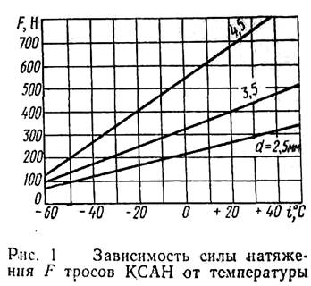 Наиболее распространенными неисправностями тросового управления являются: потертость тросов, обрыв отдельных нитей или прядей, нагартовка в местах перегибов на роликах, выпучивание нитей или прядей тросов, коррозия при наличии обрыва нитей, за-ершенности, вспучивания отдельных нитей или прядей трос заменяют. После замены троса обязательно проверяют правильность и величину отклонения рулевой поверхности и натяжения троса. Если фактическое натяжение данного диаметра троса, замеренное тензометром при определенной температуре наружного воздуха, не отличается от натяжения троса (такого же диаметра при той же температуре) в соответствии с графиком (рис. 1), то перерегулировку натяжения тросов не производят.