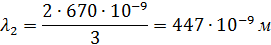 3. На дифракционную решетку нормально падает пучок света от разрядной трубки, наполненной гелием. На каждую линию λ2 в спектре третьего порядка накладывается красная линия гелия с длиной волны λ1 =670 нм спектра второго порядка.
