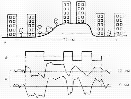 а – схема трассы; б – вид предаваемых сигналов; в – вид принятых сигналов