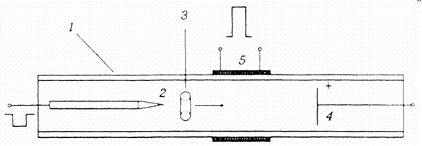 Под действием положительного напряжения на аноде 4 устойчивый электронный сгусток 3 движется в стеклянной трубке 1, на часть которой намотан проводник 5. По мере того, как электронный сгусток пересекает область трубки с проводником 5, в последнем возникает импульс тока. Эксперименты Шоулдерса показывают, что энергия возникшего в проводнике электрического импульса в 30 раз превышает энергию, которая была затрачена на формирование электронного сгустка.