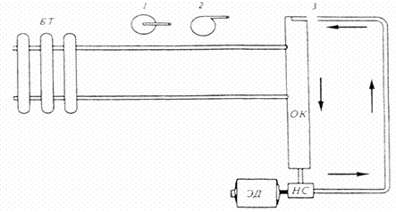 Установка Потапова. В России Ю.Потаповым разработана гидродинамическая тепловая установка с КПД, превышающим 400%. Ее блок-схема представлена на рисунке 5. Электродвигатель (ЭД) приводит в движение насос (НС), заставляющий циркулировать воду по контору (на рис. 15 показано стрелками). Контур содержит цилиндрическую колонку (ОК) и батарею отопления (БТ). Окончание трубы 3 можно подключить к колонке (ОК) двумя способами: к центру колонки; по касательной к окружности, образующей стенку цилиндрической колонки.