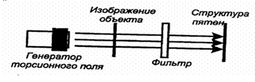 Берется изображение поверхности Земли, снятое со спутника (или самолёта - не важно как), и проводится его специальная обработка (рисунок 6). Прежде всего, нужно избавиться от видимого изображения, т.к. оно ничего не лает для анализа геологических пород в глубине земли. Далее мы просвечиваем эту картину торсионным генератором и получаем поле, которое промодулировано полем эмульсии данной картинки. Пройдя фотографию, излучение будет содержать только информацию о спиновой структуре эмульсии. Затем ставим фильтр, который будет пропускать только те частоты, которые соответствуют тому полезному ископаемому, которое нас интересует. Этому излучению мы подвергаем обычную фотопластинку, помещаем её в особые физические и химические условия и в результате получаем некую структуру пятен. Эти пятна абсолютно точно соответствуют расположению искомых полезных ископаемых на данной территории. Конечно, с той точностью, которую обеспечит разрешающая способность фотоаппаратуры и точность топографической привязки к местности.