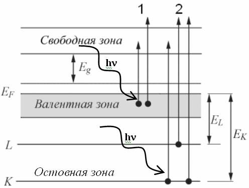 В фотоэлектронной спектроскопии твердых тел анализируется кинетическая энергия электронов, испущенных при облучении твердых тел моноэнергетическими фотонами с энергией hν
