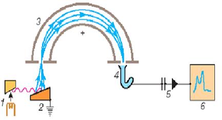 Из уравнения h ν = Eсв + Eкин видно, что если известны величины h ν и Eкин , то можно определить энергию ионизации Eион или энергию связи Eсв соответствующего уровня. Для определения Eкин используются специально созданные электронные спектрометры. Электронный спектрометр (рис. 3) состоит из трех основных частей, в которых соответственно происходят генерация электронов, анализ их энергии и регистрация. В спектрометре поток ионизирующего излучения направляется на образец. Электроны могут быть выбиты из любой оболочки молекулы, ионизационный потенциал которой меньше энергии облучения. Выбитые электроны попадают в анализатор энергий электронов спектрометра. В анализаторе электроны описывают различные траектории в зависимости от своих энергий и напряжения, приложенного к электродам анализатора.