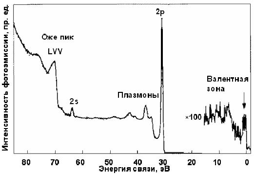 Линии 2s и 2p отчетливо видны в виде острых пиков, это и есть остовные уровни, положение которых определяется энергией связи электронов, что является характеристикой данного элемента. Т.е. присутствие пиков при данной энергии связи является свидетельством присутствия на поверхности данного элемента (содержит информацию о химическом составе поверхности).