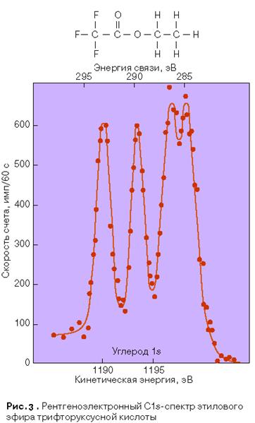 Для иллюстрации зависимости энергии связи электрона в атоме от химического окружения атома часто используют рентгеноэлектронный 1s-спектр углерода этилового эфира трифторуксусной кислоты (рис. 3). Четыре максимума C1s почти равной интенсивности в весьма изящной форме представляют четыре окружения атомов углерода в этой молекуле.