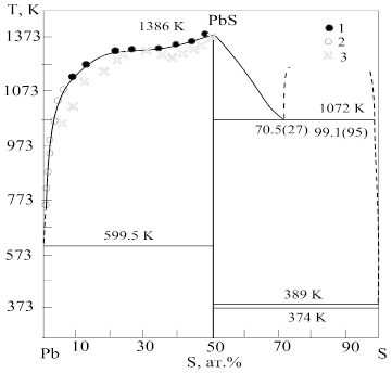 Т-х-проеція діаграми стану системи показана на рис. 1.1. В системі знайдено одну сполуку – моносульфід свинцю РbS, що плавиться конгруентно при 1386 К [10]. Ліквідус в області складів 50-100% атомного вмісту сірки не був раніше визначений у зв’язку з високою пружністю пари сірки [2]. На рис. 1.4 ця частина діаграми побудована за даним роботи [11], де проводився диференціальний термічний аналіз під тиском 5·106 Па. Була знайдена область розслоювання з протяжністю від 70,5 до 99,1 % атомного вмісту сірки при монотектичній температурі 1072 К. У присутності сульфіду свинцю сірка плавиться при 387±1 К, що співпадає з температурою плавлення чистої сірки в межах похибки експерименту. Перетворення орторомбічної модифікації проходило при 374±2 К. Ліквідус для області складів 0-50% атомного вмісту сірки побудований за даними робіт [10, 12, 13], які знаходяться в добрій відповідності. Крива ліквідусу побудована за даними термічного аналізу [10], при екстраполяції добре сходиться з кривою ліквідусу, що знайдена з даних хімічного аналізу за розчинністю сірки в рідкому свинцю для сплавів з вмістом сірки 10% [13]. Для області менше 1% атомного вмісту сірки, її розчинність в рідкому свинцю відмічається при таких температурах і складах: 923 К і 0,59% атомного вмісту сірки, 873 К і 0,33; 833 К і 0,16; 773 К і 0,08; 723 К і 0,03% атомного вмісту сірки [13]. Так як між 20 і 40% атомного вмісту сірки точки кривої ліквідусу лежать майже на горизонтальній лінії, в ряді робіт не виключалась можливість існування області розслоювання в рідкому стані для цього інтервалу складів [2]. Склад евтектики зі сторони свинцю лежить при 0,0017% атомного вмісту сірки і одержаний екстраполяцією лінії ліквідусу [13]. Температура плавлення евтектики практично співпадає з температурою плавлення чистого свинцю.