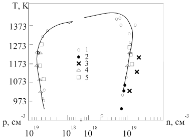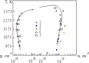 Рис.2.1. Експериментальні ізотерми концентрації носіїв струму кристалів PbS від парціального тиску сірки при різних температурах відпалів [2].