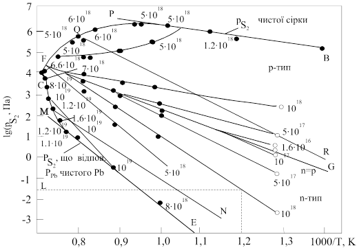 Парціальні тиски пари сірки, що відповідають стехіометричному складу, показані суцільною лінією FG, яка ділить область всередині трифазової петлі на обласпь n-типу (багату свинцем) і р-типу (багату сіркою).