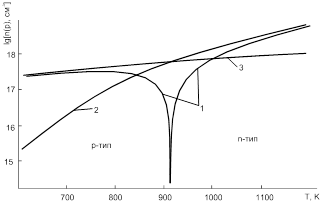 На рис. 1.3 показані склади рівного відхилення від стехіометрії в сторону надлишку свинцю і надлишку сірки. Із збільшенням температури лінії однакової концентрації носіїв наближаються до стехіометичної лінії і для достатньо низьких концентрацій носіїв зливаються з нею. Лінія стереометричного складу перетинає петлю трифазової рівноваги при 1350 К.
