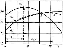 ГТУ (εг ). В точке 2 газовая и пароваячасти установки имеют равные к. п. д. С уменьшением величины d точка 3 (максимум к. п. д. ПГУ) смещается влево, и при d→ О она совпадает с точкой 1 (максимум к. п. д. ГТУ).