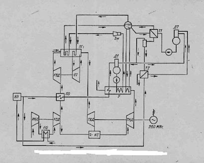 Рис. 2 Тепловая схема ПГУ мощностью 200 МВт на парогазовой смеси