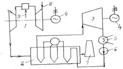 1 – ГТУ; 2 – котел-утилизатор; 3 – паровая турбина; 4 – электрические генераторы; 5 – конденсатор паровой турбины; 6 – питательный насос; 7 – дымовая труба; 8- воздух из атмосферы; 9- топливо в камеру сгорания ГТУ.