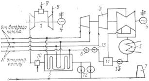 1 – 9 – см. рис. 1; 10 – блок основных горелок котла; 11- смешивающий ПНД; 12 – дымососы котла; 13 – конденсатные насосы.