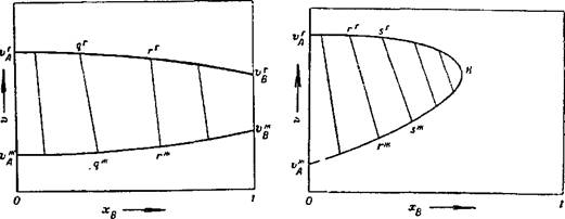 Помимо диаграммы Т —р при постоянном составе, полезно исследовать зависимость мольных объемов обеих фаз от состава при постоянной температуре. Если температура ниже любой из критических температур па критической кривой, диаграмма имеет вид, изображенный на рис.3.