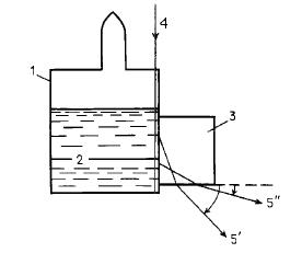 Рис.14. Устройство для измерения пристеночных значений показателя преломления: 1 – цилиндрическая кювета из стекла, 2 – бинарная смесь, 3 – измерительный кубик с показателем преломления N, 4 – световой луч, 5’ и 5” – лучи, выходящие из верхней и нижней фазы соответственно.