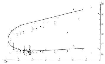 Зависимость показателя преломления сосуществующих фаз системы метанол-гептан от температуры (ветвь 1 – верхняя фаза, обогащенная гептаном, ветвь 2 – нижняя фаза, обогащенная метанолом). Темные значки – пристеночные значения (температурный режим 1), светлые значки и сплошная линия – объемные значения, измеренные по другой методике.