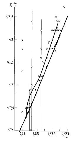 Измерения проводились при двух температурных режимах. При режиме 1 осуществлялось ступенчатое нагревание образца от 20 о С до критической температуры (Тс = 52,9 о С). При каждой температуре образец длительно термостатировался, после этого смесь перемешивалась путем встряхивания, и затем измерялся показатель преломления. Следующее измерение проводилось при большей температуре. При режиме 2 образец предварительно нагревался до температуры выше критической, перемешивался до однородного состояния и затем ступенчатым образом охлаждался с термостатированием в точках наблюдения. В режиме 2 встряхивание перед измерением не требовалось, так как система сама достигает равновесного состояния.
