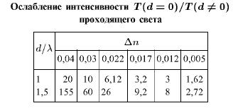 В таблице представлено ослабление интенсивности проходящего света Т(d = 0)/Т (d ≠ 0) в зависимости от Δn = n1 – n2 для двух значений толщины слоя: d/λ = 1 и 1,5, где Т – коэффициент пропускания.