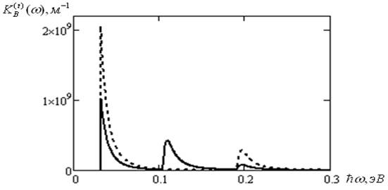 На рисунках 4 и 5 представлена зависимость коэффициентов примесного поглощения в случае поперечной поляризации света от величины магнитной индукции для энергии фотона ℏω = 0,15 эВ (рисунок 4 – с учетом лоренцева уширения уровней энергии электрона, рисунок 5 – с учетом дисперсии размеров квантовой точки).