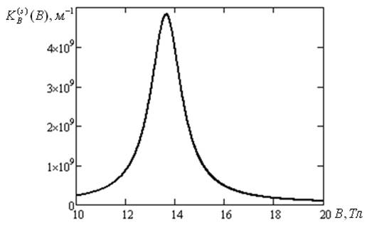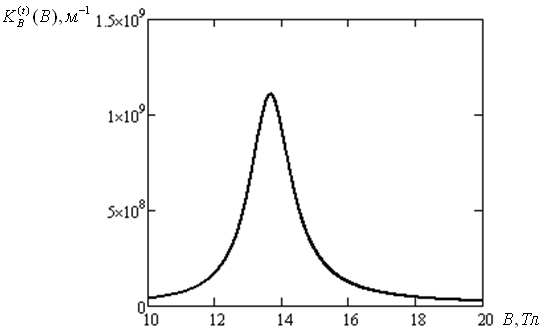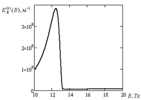 Рисунок 4 – Зависимость коэффициента примесного поглощения с учетом лоренцева уширения уровней энергии электрона от величины магнитной индукции ( ℏ ω = 0,15 эВ)