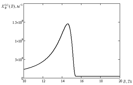 Рисунок 8 – Зависимость коэффициента примесного поглощения с учетом лоренцева уширения уровней энергии электрона от величины магнитной индукции ( ℏ ω = 0,15 эВ)