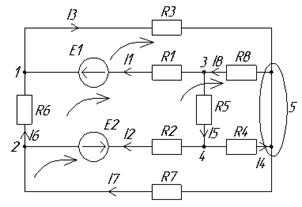 Подставив значения, получаем, что количество уравнений, составленных по первому закону равно 4, а по второму также 4. Приняв положительное направление обхода контуров и направления токов в ветвях, отметим это на схеме (рис. 2.).