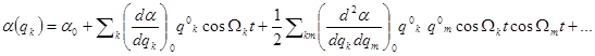 – тензор поляризуємості системи. Важливим є той факт, що поляризуємість молекули (кристала) періодично міняється в часі з частотами власних коливань молекули (кристала), оскільки поляризуємість у визначений момент часу залежить від відповідного цьому моменту розташування атомів один відносно одного [3]. Таким чином, поляризуємість є функцією координат атомів молекули (кристала), що періодично міняються з частотами власних коливань системи