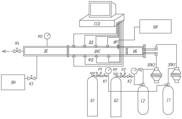 ДКС – детонационная камера сгорания, ДЕ – демпферная емкость, ИБ – инжекторный блок, ИР – искровой разрядник, БИ – блок инициирования, С1, С2 – буферные емкости, Б1, Б2 – баллоны с реагентами, ЭПК1, ЭПК2 – электро-пневмоклапаны, ВН – вакуумный насос, ФД – фотодиоды, ДД – датчики давления, ССД – система сбора данных, К1, К2, К3, К4 – краны, Р1, Р2 – редукторы, М1, М2, М3 – манометры.