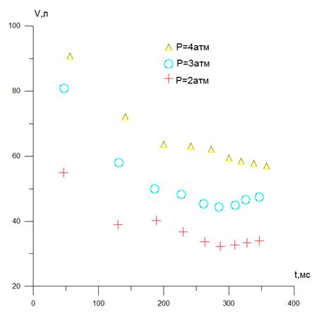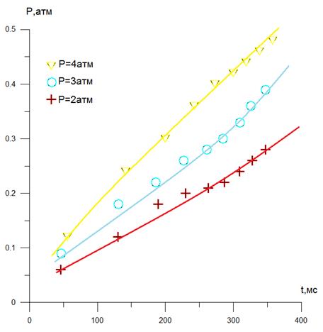 миллисекунды (рис.8). В процессе инжекции давление в буферных емкостях практически не менялось. Для этой цели объем буферных емкостей был увеличен примерно в 8 раз и составил 40 л. Так как подвижность водорода выше, чем воздуха, из-за его малого молярного веса, то для синхронного заполнения рабочей камеры компонентами детонационноспособной смеси необходимо было несколько задерживать поступление водорода относительно воздуха. Время такой задержки на открытие ЭПК легко может быть определено. Для этой цели стоит рассмотреть открытие клапанов как разрыв диафрагмы. Дальнейшее течение газа по подводящим трубкам стоит рассмотреть как движение газа за фронтом ударной волны. Для введения времени задержки используется линия временной задержки, позволяющая сдвинуть фазу сигнала на открытие водородного ЭПК относительно открытия воздушного ЭПК на 4 мс. Время открытия клапанов регулируется с помощью блока задержки.