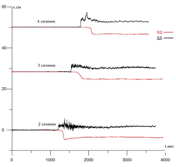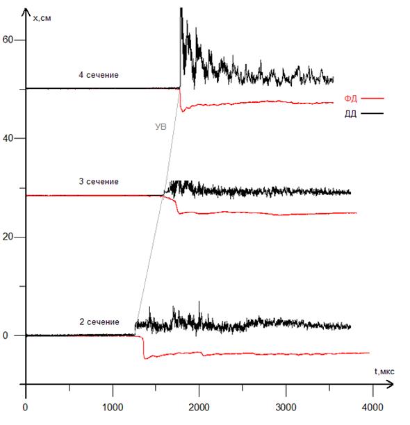 В нашем случае датчики давления располагались во 2,3,4 сечениях, а световые датчики в 1,2,4,5 сечениях детонационной камеры сгорания (рис.14.).