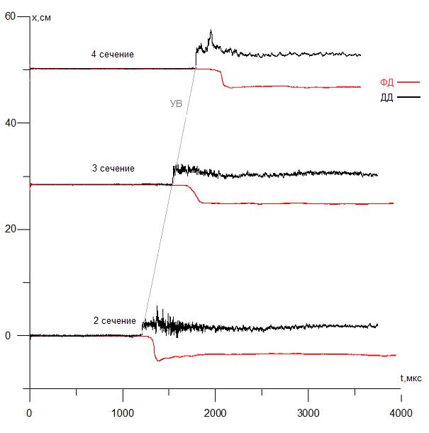 Таблица 2. Скорости распространения: D – ударной волны, W – фронта пламени, в соответствующих сечениях.