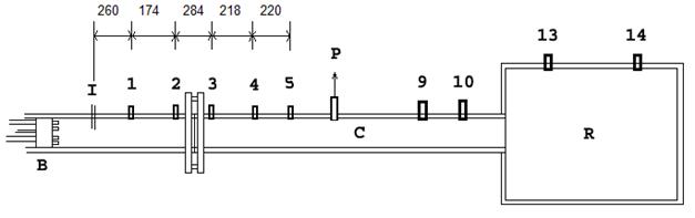 Рис.18. Общий вид детонационной камеры сгорания. B – инжекторный блок, C – детонационная камера сгорания, I – искровой разрядник, P – выход к насосу, R – демпферная емкость (цилиндрическая бочка), 1, 2,…- измерительные датчики. Между 2-м и 3-м сечениями установлена медная диафрагма.