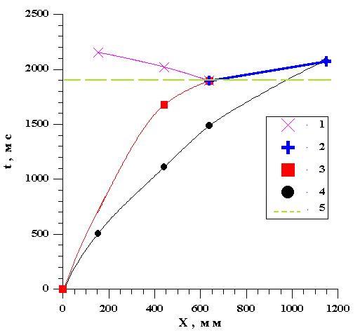 Рис.2 1 . Диаграмма инициирования детонации в движущейся смеси. 1 – волна ретонации, 2 – детонационная волна, 3 – фронт пламени, 4 – ударная волна, 5 – скорость детонации Чепмена-Жуге.