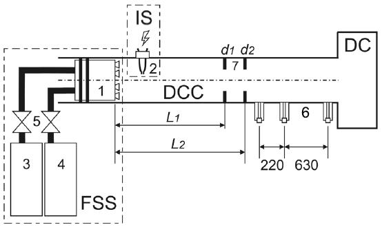 Рис.21. Схема экспериментальной установки. DC- демпферная ёмкость, DCC- детонационная камера сгорания, IS- искровая система, FSS- система снабжения топливом, 1- инжекторный блок, 2- искровой разрядник, 3,4- буферные ёмкости, 5- электро-пневмоклапаны, 6- фотодиоды, 7- препятствия.